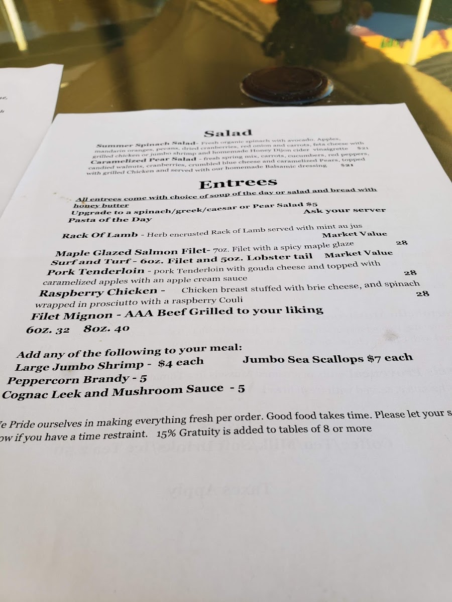 Guests often enjoy vibrant starters like a fresh house salad or a comforting bowl of potato soup to begin their meal. The main courses showcase a range of flavors and textures—from tender salmon with dill sauce and risotto to rich, flavorful choices such as sriracha blue cheese fettuccini with steak or pork tenderloin glazed with whiskey. The menu also features carefully prepared poultry options like raspberry chicken and stuffed chicken breast, complementing the bistro’s emphasis on thoughtful, well-rounded meals. Handmade bread and butter frequently accompany plates, adding a welcoming, homemade touch.